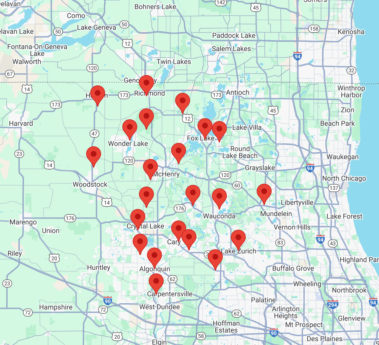 Algonquin, Barrington, Bull Valley, Carpentersville, Cary, Crystal Lake, Deer Park, Fox Lake, Fox River Grove, Fox River Valley Gardens, Hawthorn Woods, Hebron, Hoffman Estates, Holiday Hills, Ingleside, Inverness, Island Lake, Johnsburg, Kildeer, Lake Barrington, Lake in the Hills, Lake Zurich, Lakemoor, Long Grove, McCullom Lake, McHenry, Mundelein, North Barrington, Oakwood Hills, Port Barrington, Prairie Grove, Richmond, Ringwood, Solon Mills, South Barrington, Spring Grove, Tower Lakes, Trout Valley, Village Of Lakewood, Volo, Wauconda, Wonder Lake, Woodstock